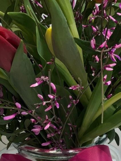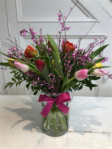 A cheerful, bright, and bold display of gorgeous tulips with seasonal foliage, beautifully arranged in a glass milk churn vase. The deluxe option includes extra tulips.