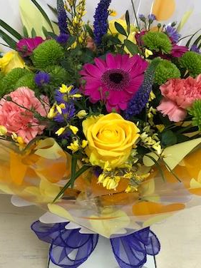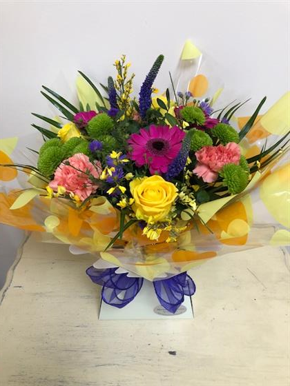 Bold, bright and beautiful selection of seasonal blooms. Including germini, roses, statis, carnations, chrysanthemums finished with seasonal fillers and foliage.