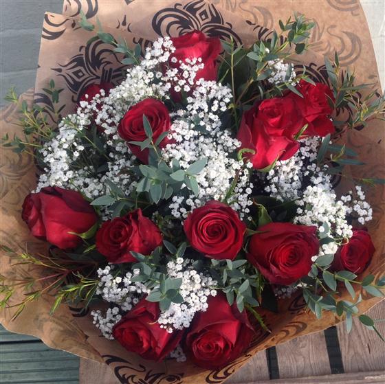 12 luxurious long stemmed red roses with soft white gypsophila and seasonal foliages, handtied in water and gift wrapped, finished with ribbon.
