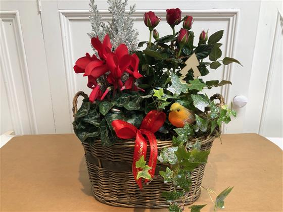 A festive planted garden featuring long-lasting seasonal plants, perfect for both indoor and outdoor settings. Arranged beautifully in a large 28cm wicker basket, it includes a snow tree, cyclamen, rose plant, frosted ivy, and charming Christmas decorations with ribbons.