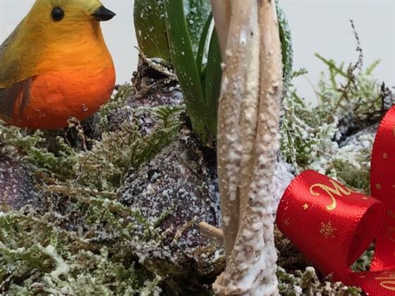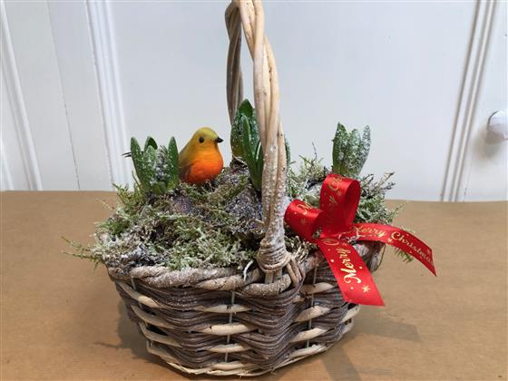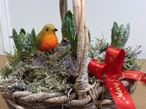 A lovely basket of planted scented hyacinths finished with a dusting of snow a robin decoration and ribbons.