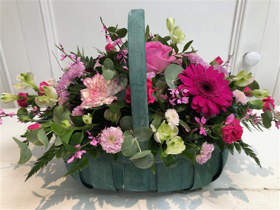 A beautiful trug basket brimming with lovely pink seasonal blooms, accented by eucalyptus and lush foliage, all artfully arranged in oasis.