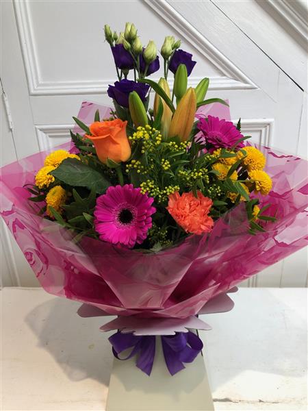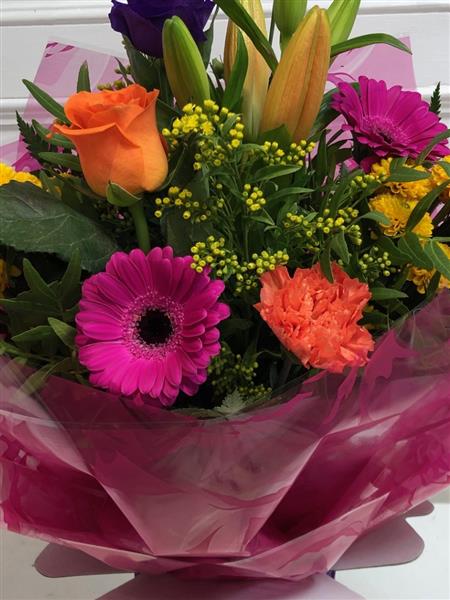 A stunning handcrafted bouquet of seasonal flowers bursting with color and joy, hand-tied in water with gift wrapping and a ribbon to complement the vibrant hues.