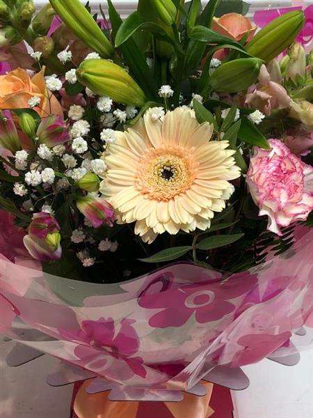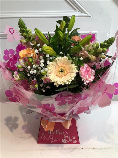 This pretty pastel bouquet is handcrafted with the finest quality seasonal flowers including asiatic lillies, roses, alstromerias, antirrhinums, germinis, gypsophilia and seasonal foliages. Handtied and presented in our Mothers day packaging