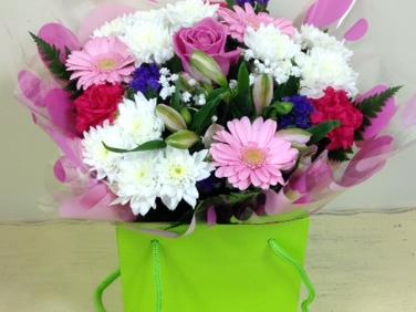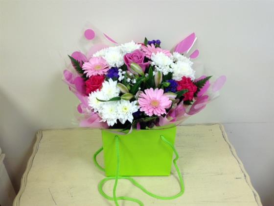 Pretty pink and white flowers arranged in a mini handtied bouquet, finished in water and presented in a gift bag.