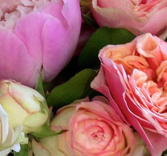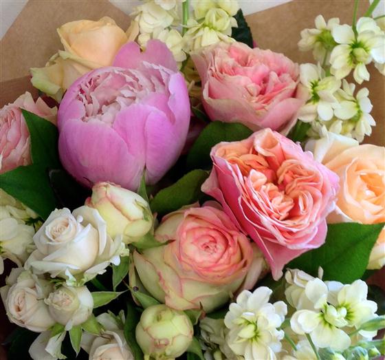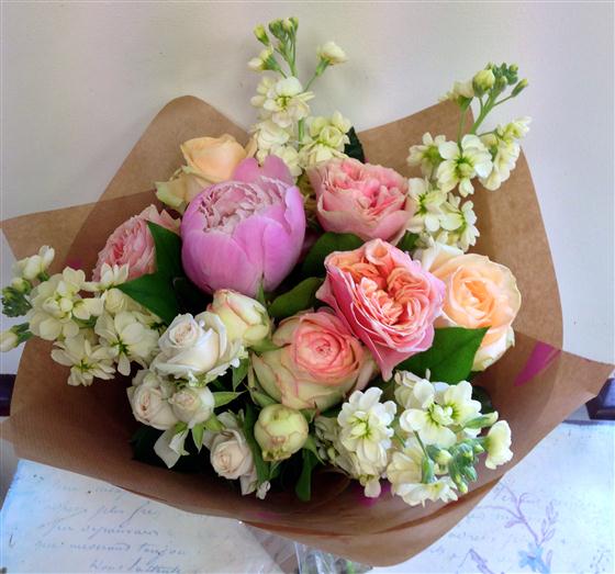 A summer gift of soft pastel roses, spray roses and stocks. Simple and elegant.