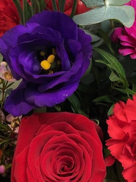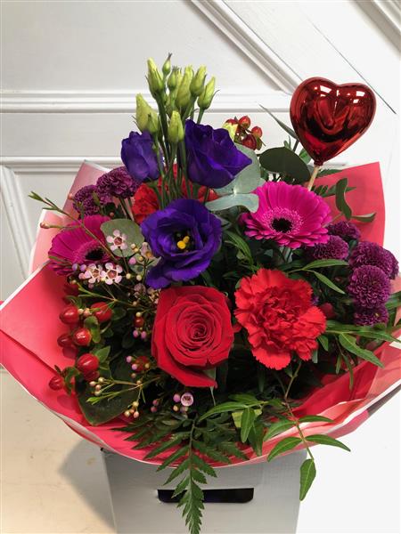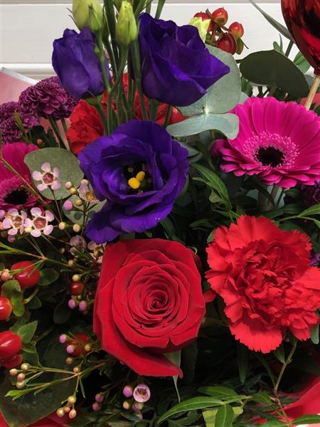 A stunning bouquet of romantic blooms featuring a red rose at the center, surrounded by purple lisianthus, waxflowers, red hypericum, and cerise pink germinis, complemented by seasonal flowers and foliage. Hand-tied in water and beautifully gift-wrapped in a presentation box.