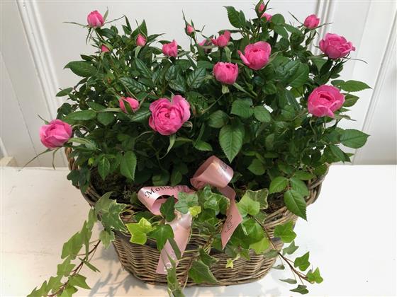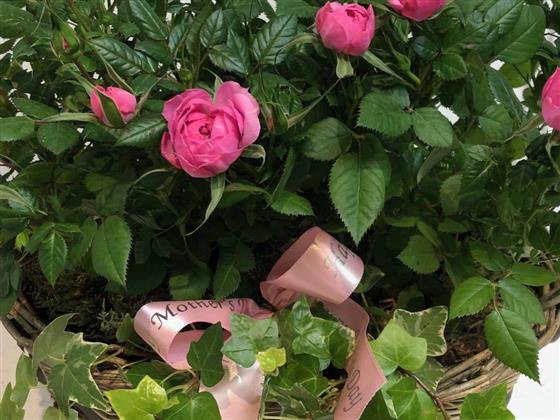 Pretty pink rose plants arranged in a 28cm wicker basket, decorated with Happy mothers day ribbon. A lasting gift that can be used for indoors or outdoors.