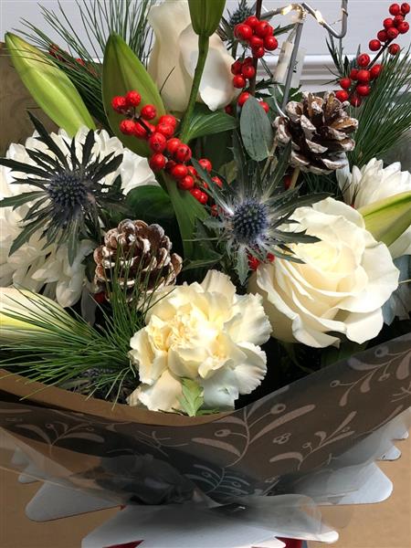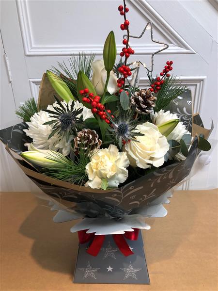 Beautiful bouquet in a hand-tied design in water, featuring white star-shaped blooms, vibrant red ilex berries, fragrant oriental lilies, large white roses, blue eryngiums, seasonal and silver foliage, all finished with gift wrapping, ribbons, and a light-up star decoration.